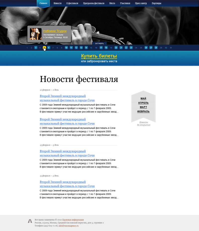 Задача: Разработать концепцию дизайна для сайтов проектов Русского Концертного Агентства, которую можно будет использовать с минимальными изменениями для различных концертов, фестивалей и т.п. мероприятий.
