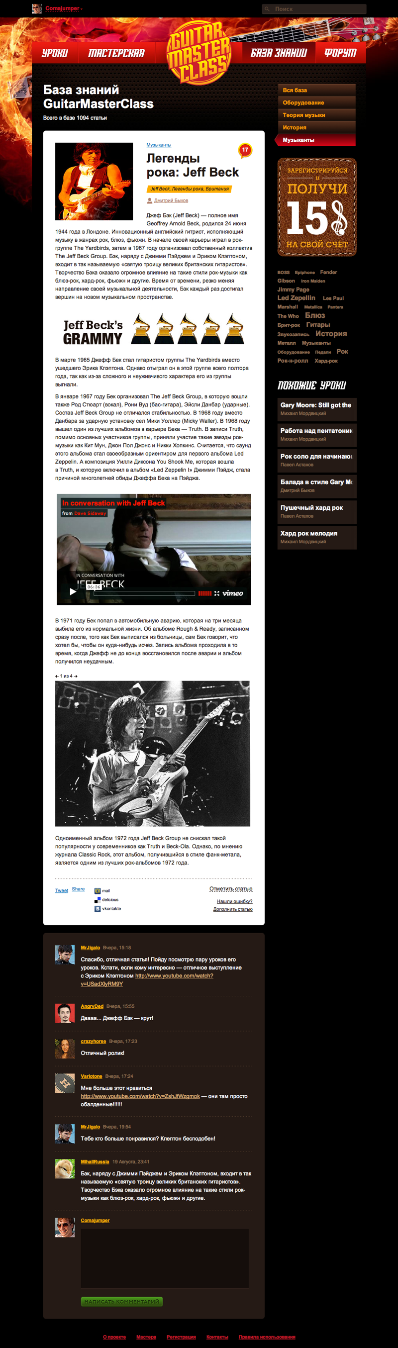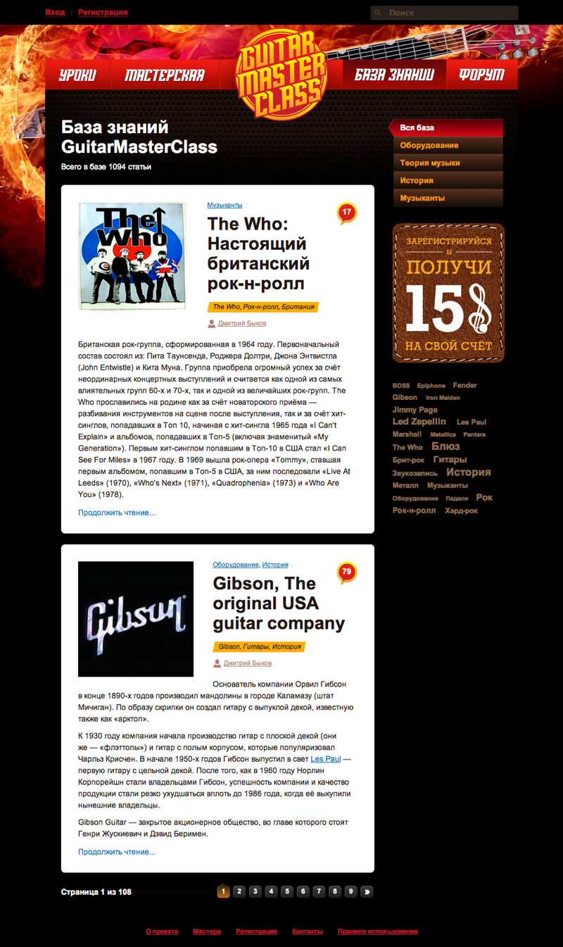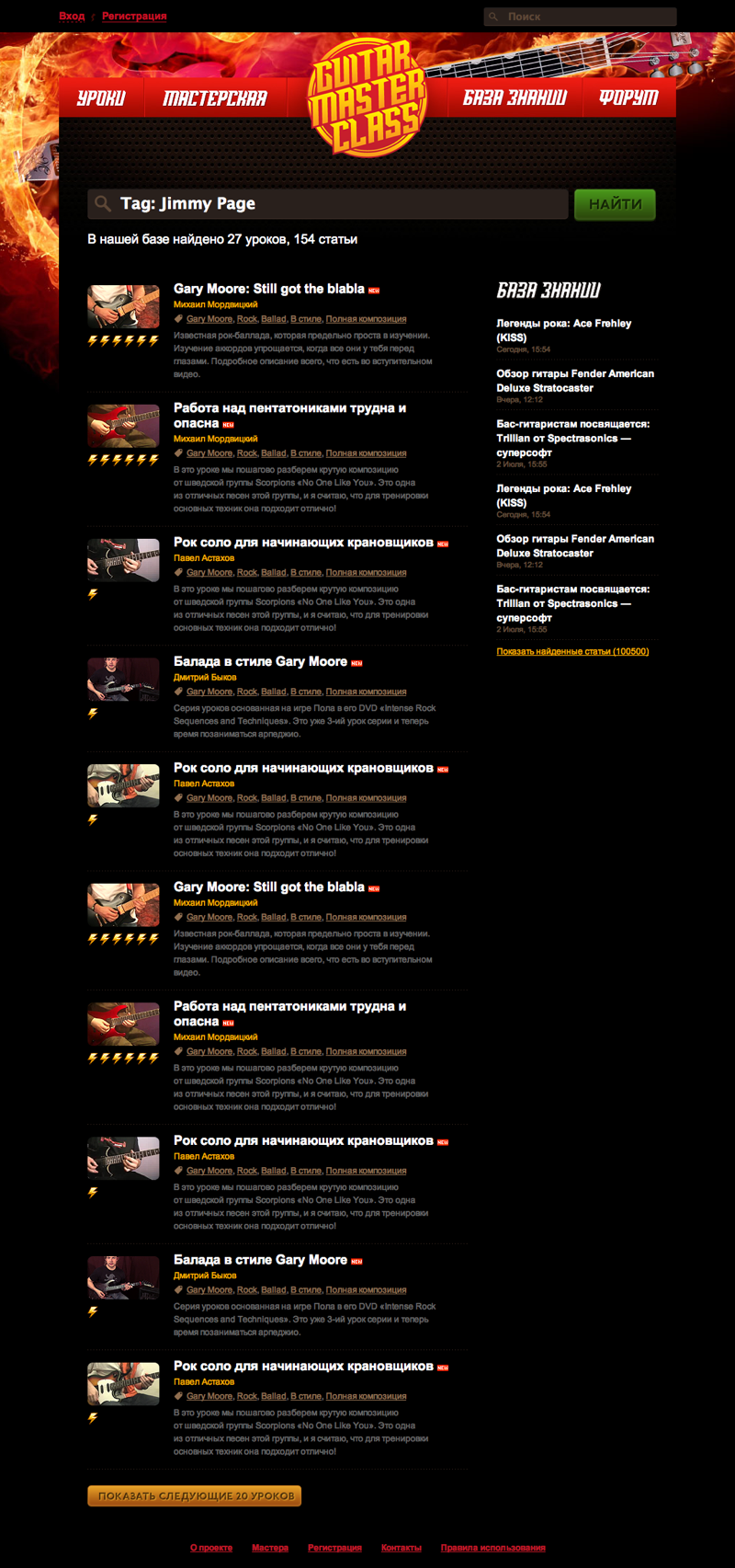 Главное преимущество проекта - это качественный материал. Все уроки классифицируются по жанрам, стилю, уровню пользователя. Есть возможность поиска уроков по исполнителю. Для удобства поиска все уроки снабжаются тегами.