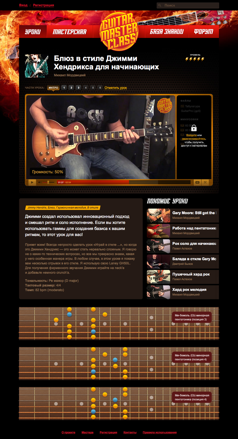 Информация по каждому уроку сопровождается не только интерактивным видео в пониженном и HD разрешение, но и партитурами, табулатурой и всевозможными минусовками.